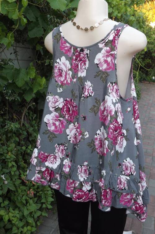 Chic and feminine asymetrical top size 40/16 by Woolworths.Loose cut with frilled hemline.Embellished front neckline.100% Viscose in liquid grey with bold pink flowers.As new