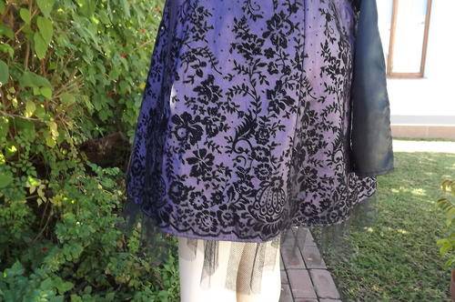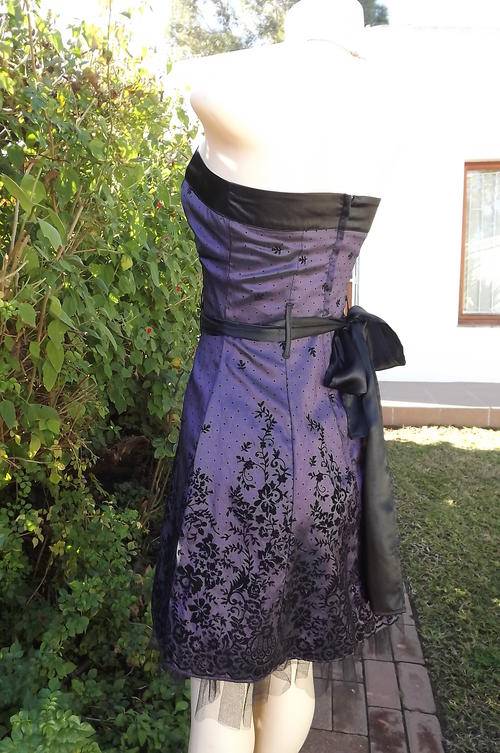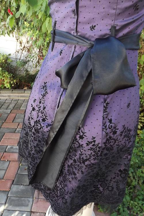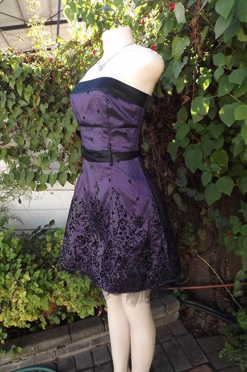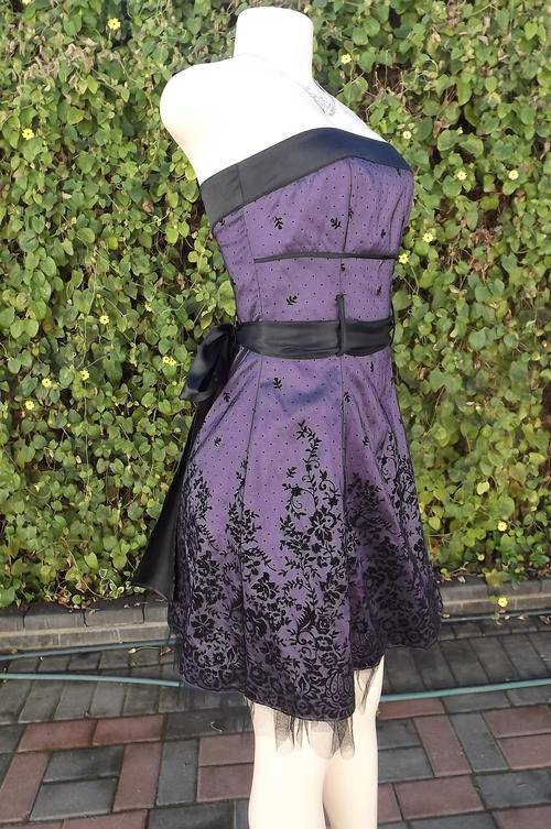 Chic & Sexy Purple & Black Cocktail Dress in size 8/32 - Purple Satin with Black Velvet Floral Pattern - Black Lining have netting frill - black wide belt to tie around middle - worn once