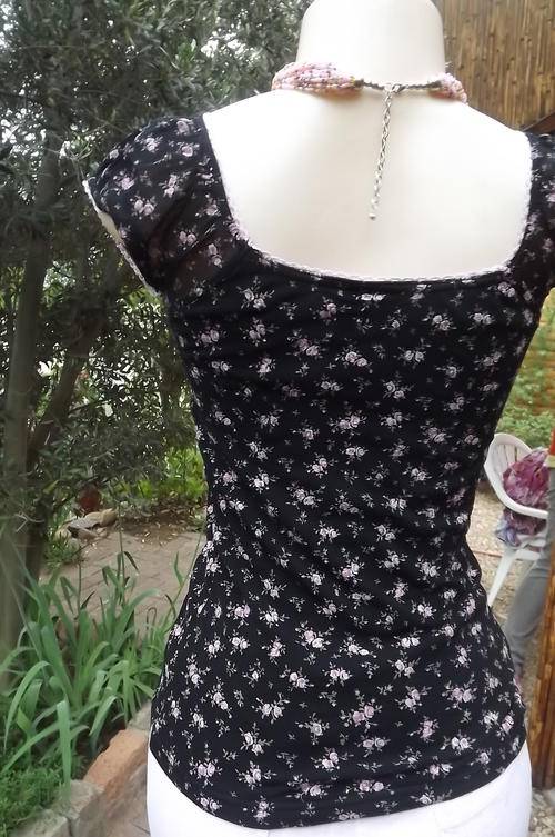 Chic & Smart Body Hugging Top in Sheer Black Nylon with Tiny Pink Roses in size 10/34 - under-layer in viscose & lycra stretch - gathering over bust area - new condition