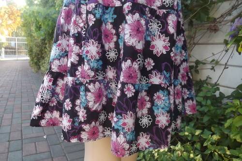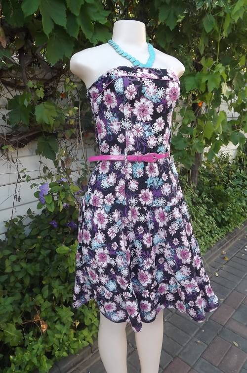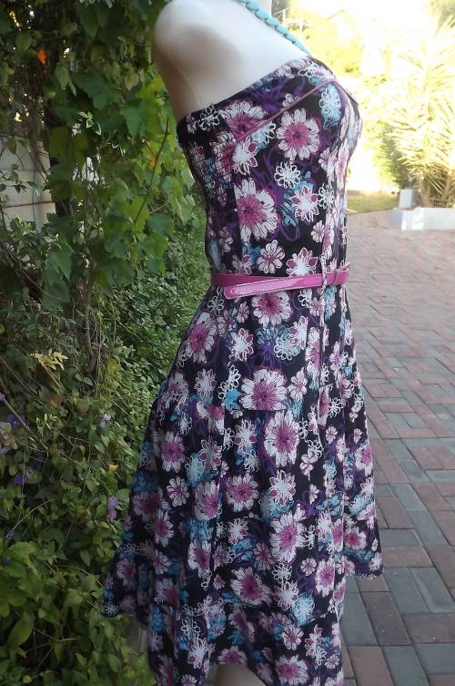 Chic strapless dress in pink and blue floral pattern on black.Size 32/8.Elasticated top back.Tiered skirt.In cool cotton fabric with belt loops.Used but in good condition.