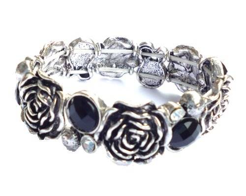 Chic Tibetan Silver Rose Stretchable Bracelet with Opal Beads & Diamantes