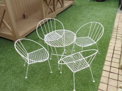 The table is approximately 40cm in diameter, and 42cm high, each chair is approximately 44cm arm to arm and the seat is 23cm x 27cm