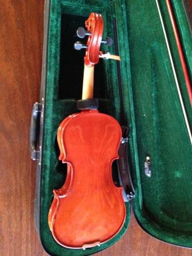 Child's Vinci Violin in Case with Bow - barely used with sandner shoulder rest. Should be suitable for ages 4-7yrs beginner. Very light. Great condition. 1 string needs to be re-attached.