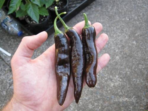 The plant grows to about a metre in a pot and would grow bigger, if you plant it in the ground. Pasilla Bajio produces amazing looking pods. The pods are around 20 cm long, 2-3 cm wide, start off dark green and ends up dark brown when they are fully ripe.