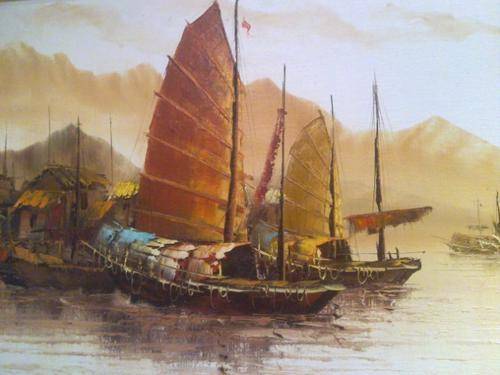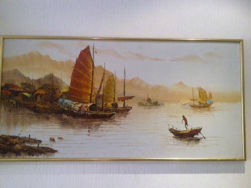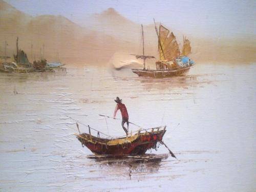 A beautiful and large oil painting with Chinese boats in the harbor. Very rich texture and impressive in any setting. The painting measures 123cm x 62cm. Make it yours today!!