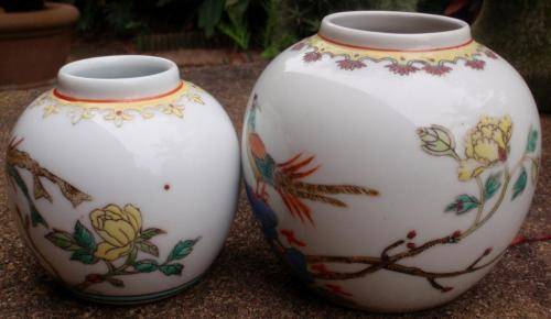 CHINESE: TWO LOVELY HAND PAINTED GINGER JARS "PEACOCK & PEONY" SIZE OF LARGER ONE: HEIGHT 11CM. SMALLER JAR: HEIGHT 9CM.