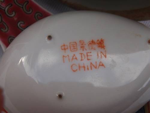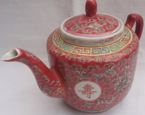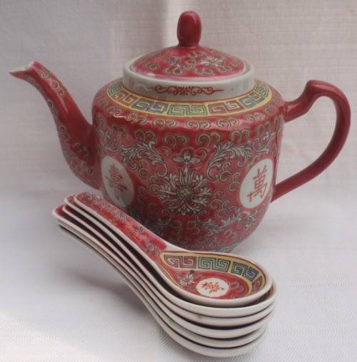 CHINESE: GORGEOUS LARGE ORNATELY PAINTED TEAPOT & SIX SPOONS. SIZE: TEAPOT HEIGHT 17CM X WIDTH 24CM (FROM SPOUT TO HANDLE) THE SPOONS DIFFER SLIGHTLY IN SIZE. PLEASE NOTE THAT ON VERY CLOSE INSPECTION AND FEELING, THERE IS A VERY SHALLOW CHIP ON THE END OF THE SPOUT (NOT NOTICEABLE AT ALL) SEE CLOSE UP PHOTO BELOW.