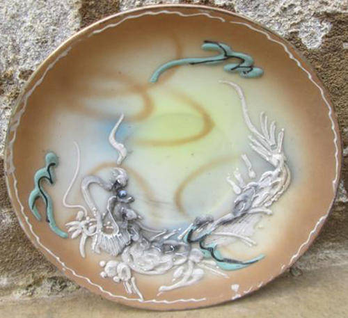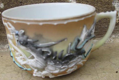MINIATURE VINTAGE ORIENTAL DRAGON WARE CUP AND SAUCER, CONDITION GOOD, HEIGHT OF CUP 3.8cm, DIA OF CUP 5.4cm, DIA OF SAUCER 9.9cm.