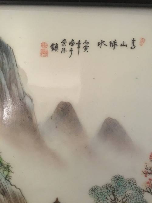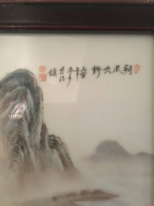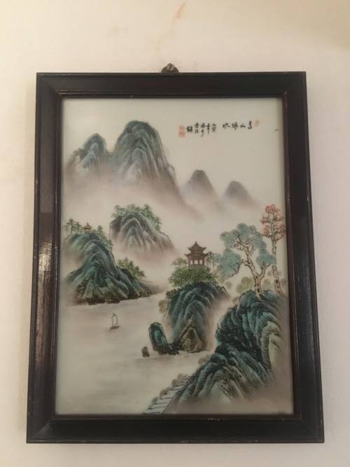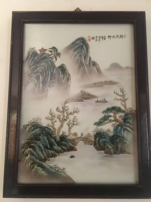 A set of two Chinese hand painted wall plaques framed and ready to mount. Measuring 27cm by 36cm. There is signs of wear on the frames although restorable. Landscape river scenes.