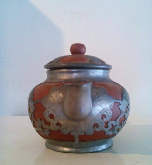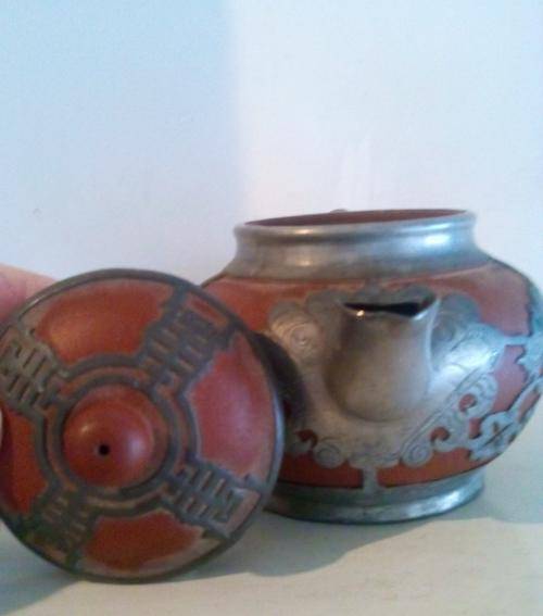 Terracotta pottery teapot clad in pewter with a fretwork dragon and Chinese letter design.Measures 180mm across and 120mm high,base is 74mm across.Stamped to base-Wen Hua Shun,190 North Gate and Wei Thai Wei City. Good condition.