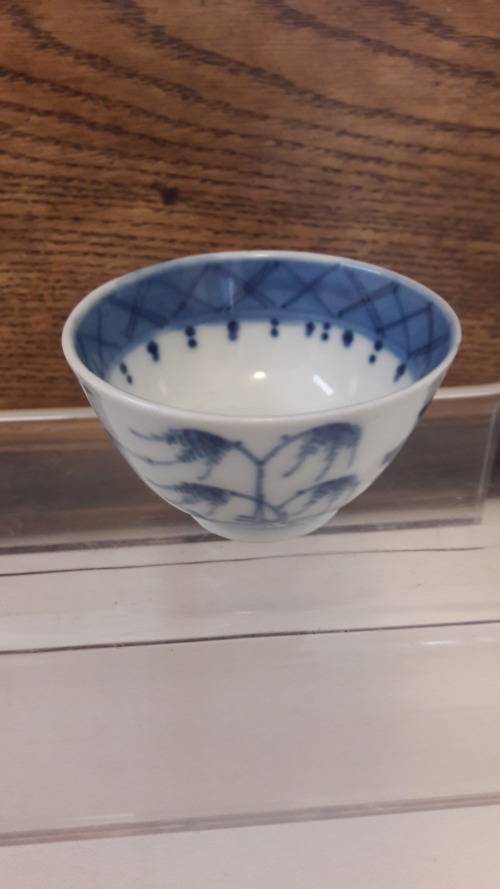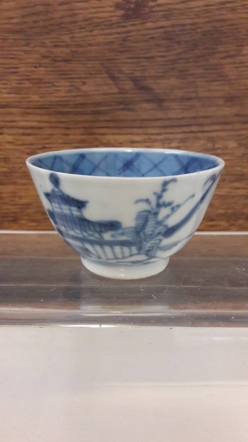 Offered for sale is a fine small Chinese tea bowl and saucer dating to the 18th Century Qianlong Qing period most likely made in Jingdezhan in the Jiangzi province . The style is typical of Chinese Provincial ware Nanking export porcelain or Batavian styled items . The cup and saucer are made from porcelain with hand painted underglaze blue decor loosely painted with a motif of pagodas , a wooded landscape with drooping trees, rocky outcrops and decorative borders with cross hatching and stipling. This style of porcelain has small glaze and manufacturing imperfections in this case a small firing crack on the base of the tea bowl and impurities in the porcelain which present as tiny pittings on the underside of the saucer or grit in the glaze. There is a fine yellowish brown rim mark on the footring of the tea bowl where the glaze did not fully adhere to the body . As a price comparison similar sets are priced on the internet at around 285 Pounds Sterling.