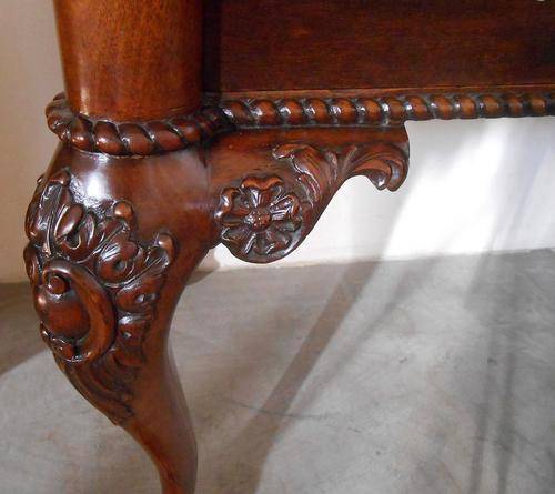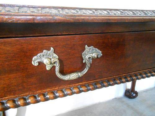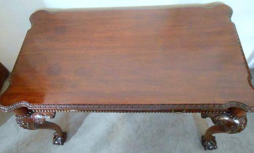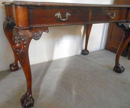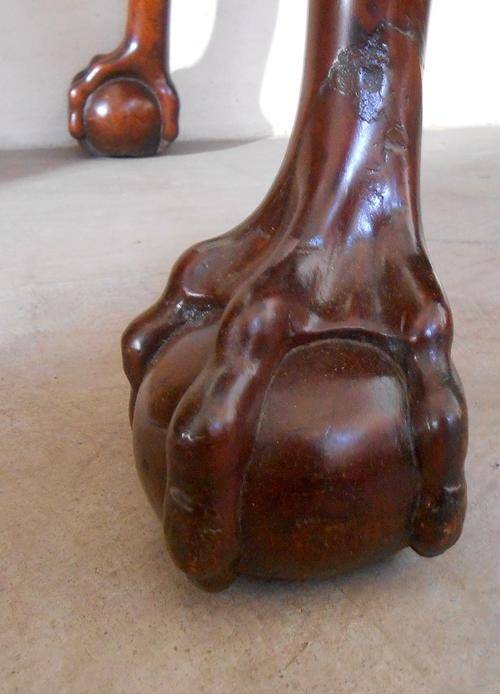 A super quality writing table with claw and ball feet. Original brass handles and one can see that all the carve work is hand carved. On the top left is 2 darker circles where the mahogany was damaged. ( I am mentioning this but the circles can hardly been seen. The item was French polished ( only two layers) and then wax polished.