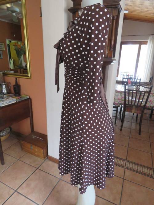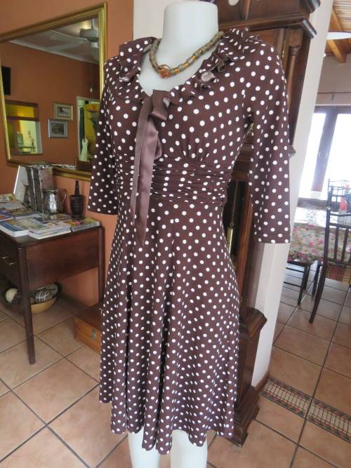 Choc brown polka dot dress with sash at waist.By 'FREE FEELING' in 32/8.Good condition.