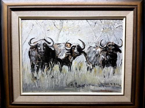 This is investment art at its finest!! This buffalo scene is magnificently executed with a pallet knife and will captivate you! It is magnificently framed and is offered directly from the artist. This beauty measures 60cm x 44cm and the frame measures 80cm x 64cm. Your opportunity to own an investment piece by one of the most talented artist is South Africa, !