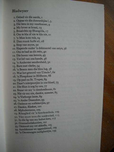 Hardeband met stofomalag. Stewig gebind en skoon binne. 1975 Uitgawe met 136 bladsye. Stofomslag bietjie verweer met insekskade en geringe papierverlies aan onderkant van rugkant. Hier is 35 van sy 70 essays wat destyds in Die Huisgenoot verskyn het. Posgeld n RSA = R47.00