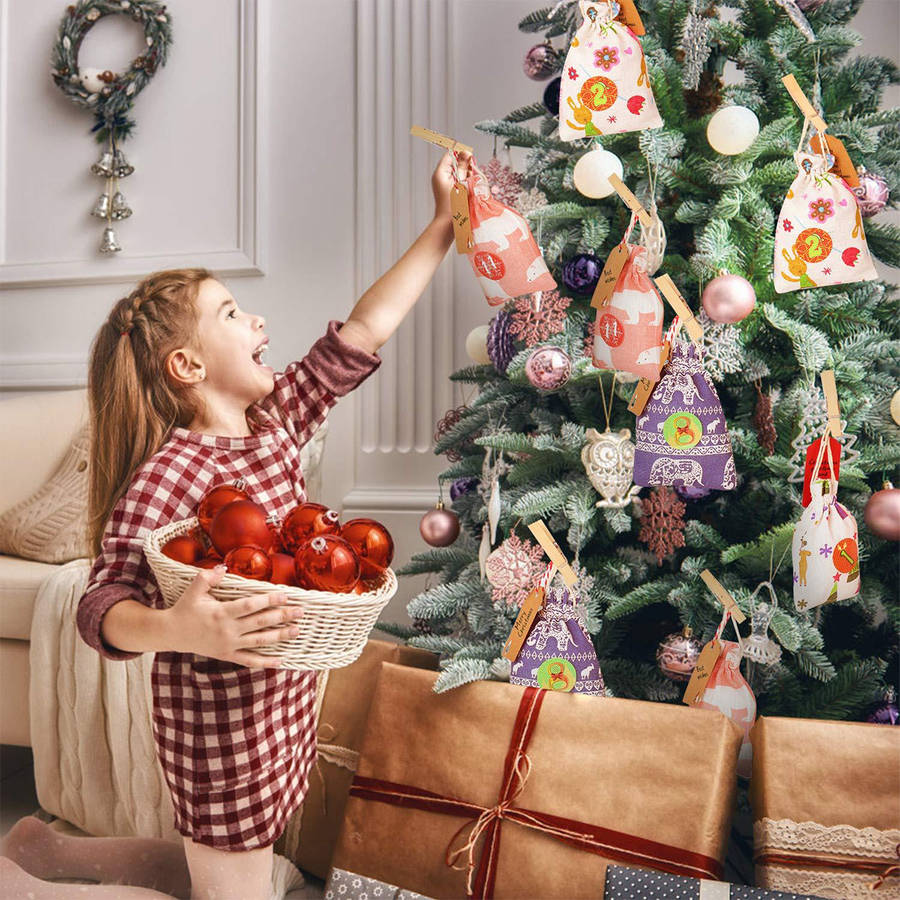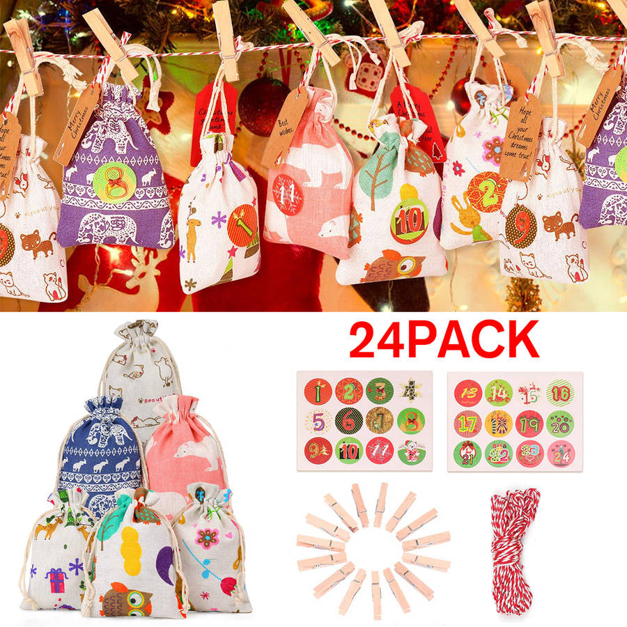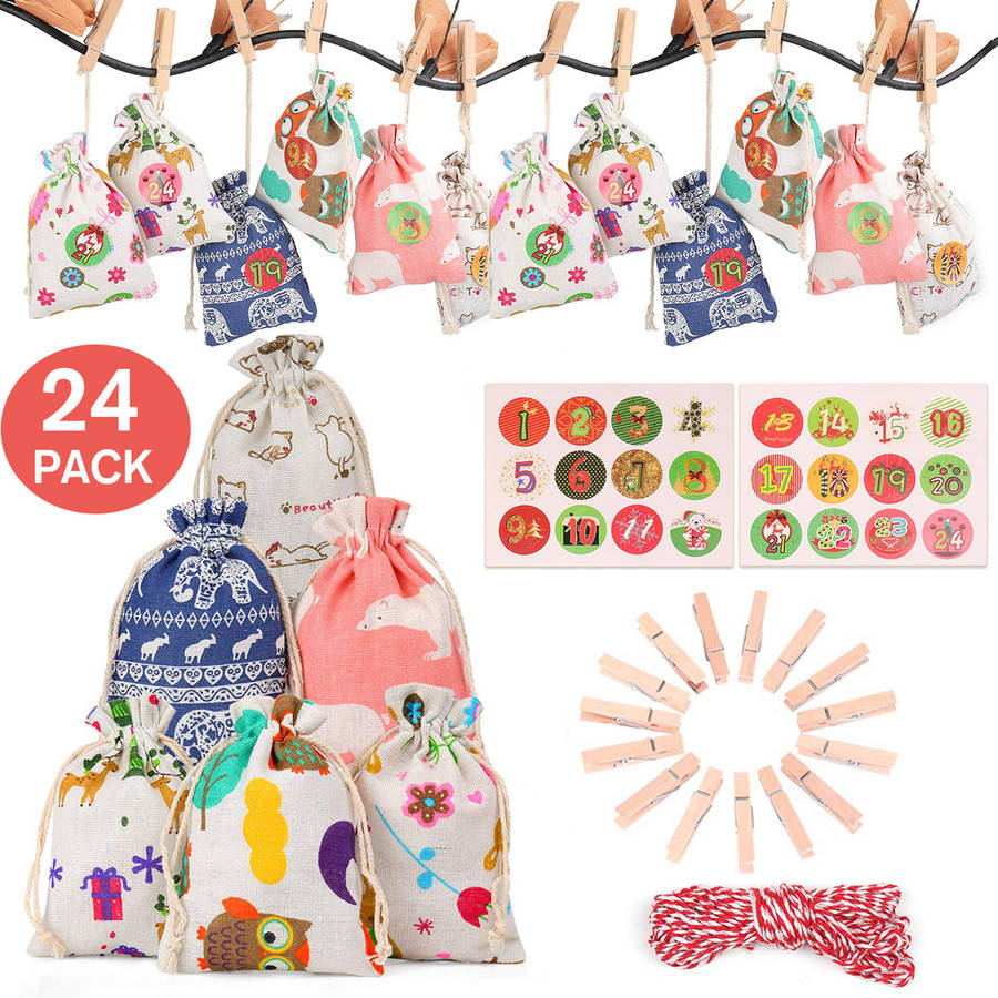 Creative design: 24 small gift bags ( random pattern), 24 small clips, 1-24 different Christmas labels, and twine.