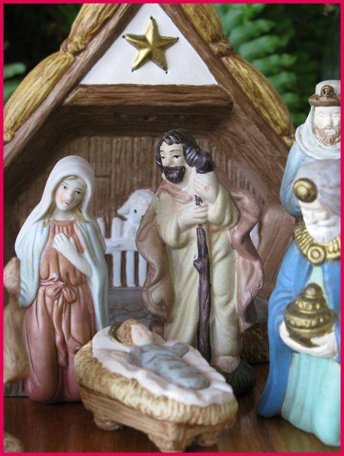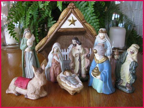 Mary, Joseph and baby Jesus. The three wise men and a shepherd with a donkey.