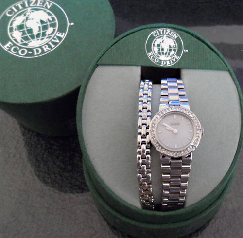made with Swarovski elements.The Citizen Women's watch features a round pale grey case