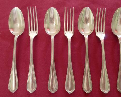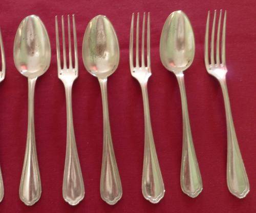 A lovely Christoffle silver plated fruit or dessert set in an attractive double thread dog-nose design. There are six forks (16cm) and six spoons (16cm). The forks are all in very good condition. The spoons show plate wear on the reserves of the bowl and four inside the bowl.