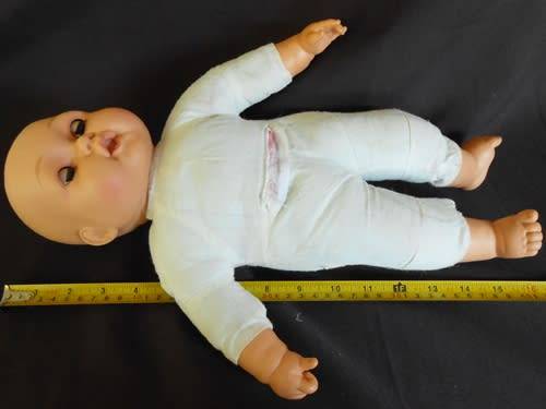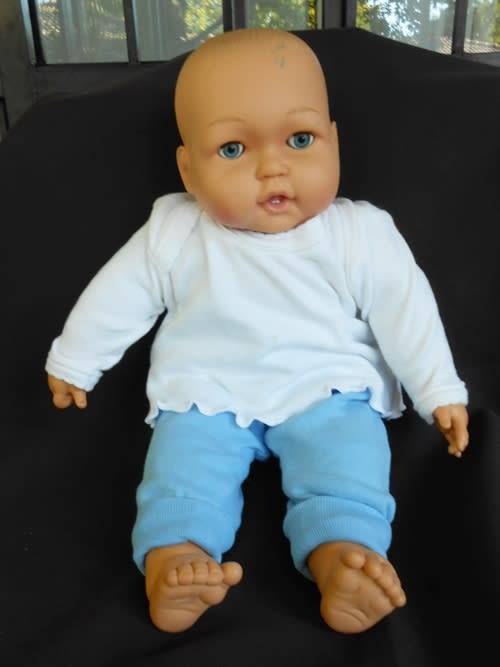 This Soft Bodied Baby doll has a battery box that is wired to the arms and legs. if the left hand is squeezed she says 'mama' and laughs when the tummy is pressed. One leg said 'Papa' but seems not to be working now. The linen body is still good and clean. there is a mark on the head above one eye. Marked Kacha Success on a sewn in fabric label.