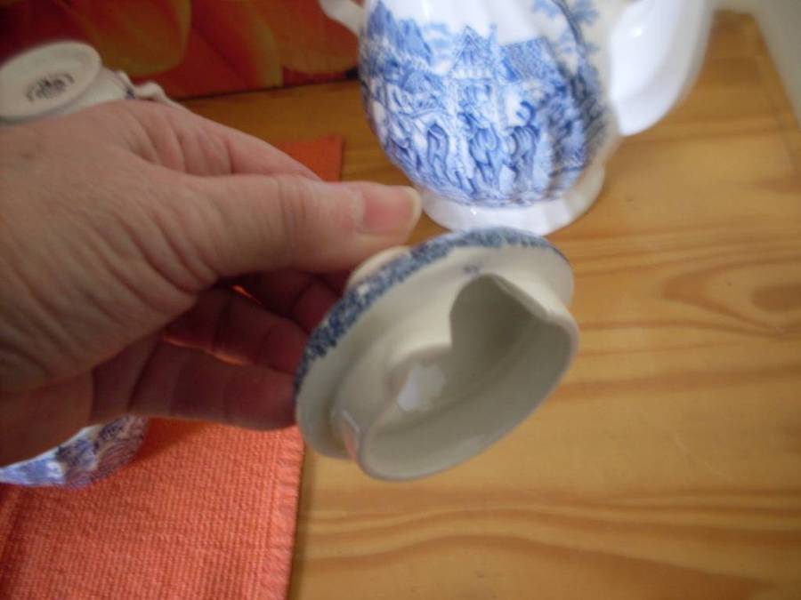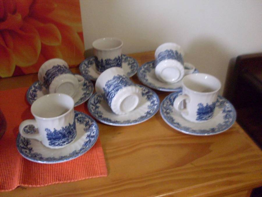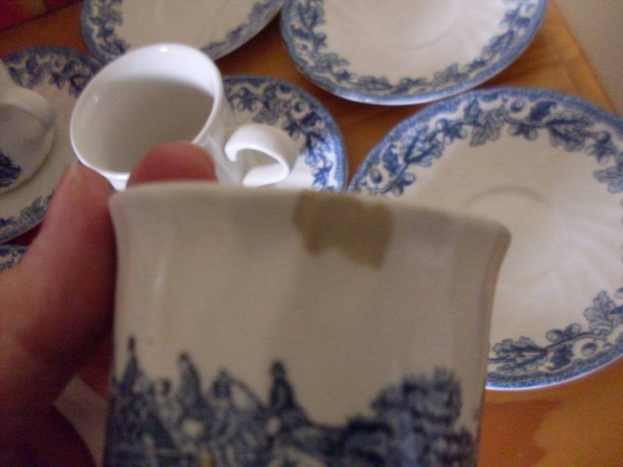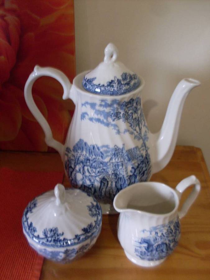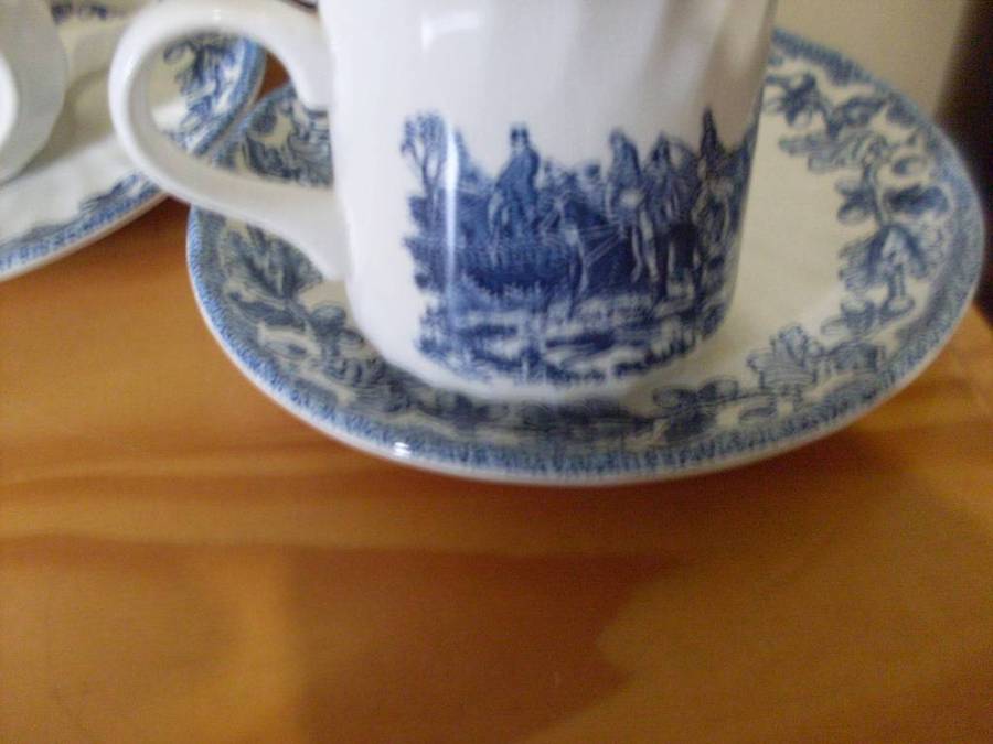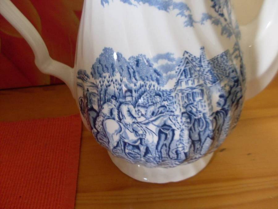 CHURCHILL BLUE & WHITE HUNTING SCENE SMALL CUP TEASET....17 PIECE.....SEE DESCRIPTION TEAPOT LID HAS A CHIP BUT NOT NOTICIABLE WHEN ON THE TEAPOT AND 1 CUP HAS A STAIN