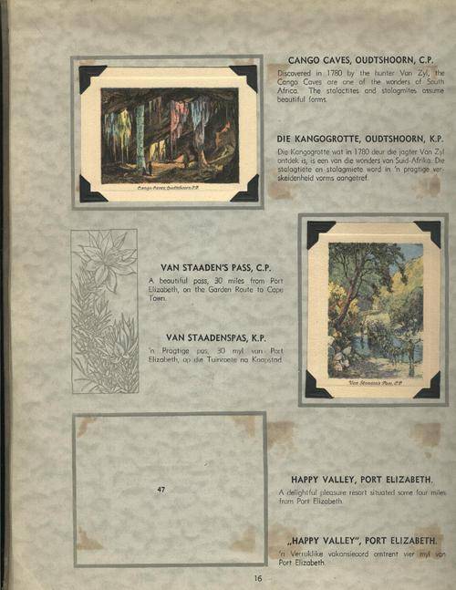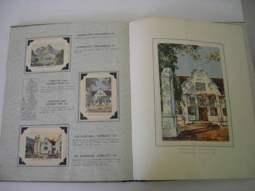 "A series of 100 drawings in colour by chase E.Peers" Cigarette Cards have been correctly inserted using photo corner ends so the cards may be removed, examined and replaced, unfortunately some offsetting has occurred on the pages from the glue used to paste the photo corners in. One card is missing from the series (no. 47 Happy Valley, Port Elizabeth). Hardcover album, the boards are faded and quite worn, the boards have also split down the gutters and inside there is some splitting between the hinges of some pages. Otherwise binding is still solid and all pages are intact and secure overall good condition. | ||
