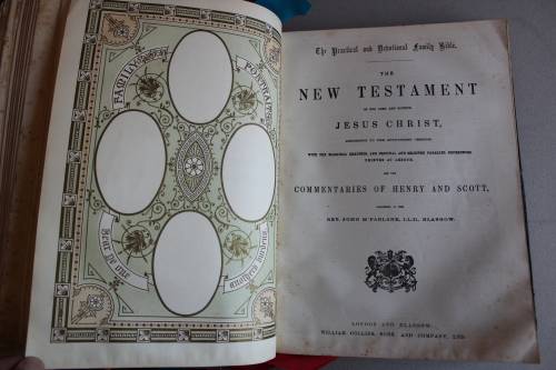 This is a circa 1871 Practical and Devotional Family Bible (New Edition) containing the New and Old Testaments with original and parallel references. And the commentaries of Henry and Scott. Condensed by the Rev. John McFarlane. With coloured illustrations. Printed in London and Glascow by William Collins, Sons and Company.