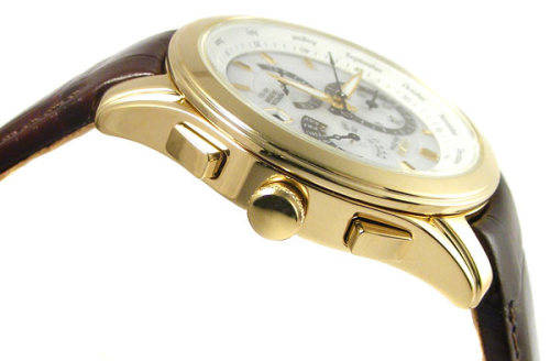 White/off-white dial with gold toned hands and markers, black second and sub dial indicators.