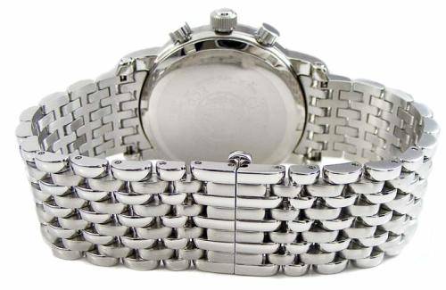Intricately designed dial trimmed in silver and blue, with 3 sudials for seconds, chronograph minutes and 24 hour time.
