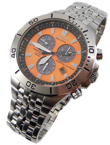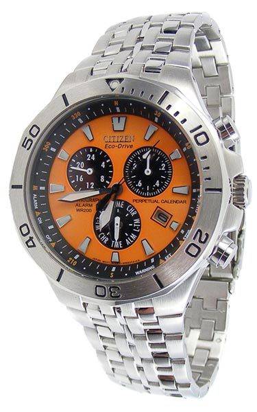 Orange dial with black sudials for mode selection, dual time display and chronograph measurement. Chronograph measures up to 60 minutes in 1/20sec increments. Hands are finished in polished steel and both hands and markers have luminous features. Brushed stainless steel unidirectional bezel with elapsed minute markers for use in conjunction with the chronograph. Perpetual date display at 4 o'clock position automatically compensates for leap years and odd and even months.. Brushed/polished solid stainless steel case and screw in case back with ECO-DRIVE logo. Scratch resistant anti reflective mineral crystal glass. Water resistance - 200m/20bar. Thick and solid brushed stainless steel bracelet with polished accent areas and two button spring release deployment clasp with fold-over lock. Case measures 45mm including crown x 13mm. Bracelet is 20mm wide and to fit a wrist of up to 210mm.