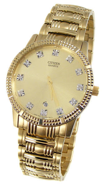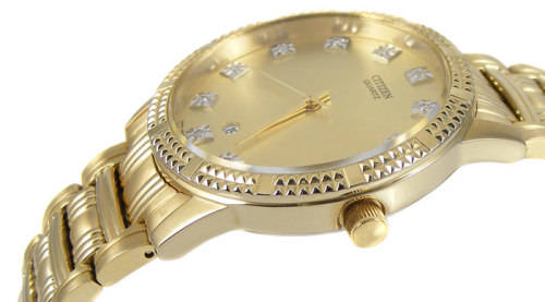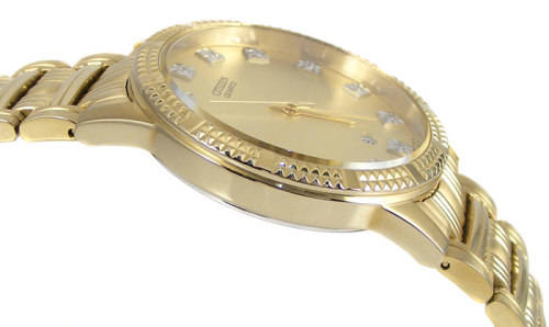 Metallic gold dial with gold toned hands and genuine diamond hour markers set in polished steel.