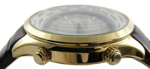 Internal world time ring operated by a second crown at the 2 o'clock position.