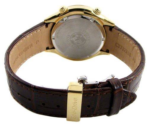 Brown genuine leather Citizen band with gold toned stainless steel butterfly clasp.
