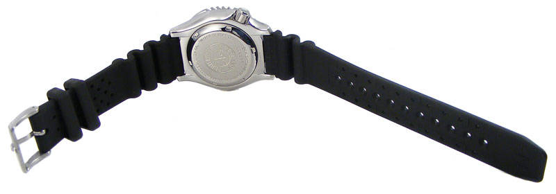 Adjustable back resin band with no dive limits table- easy to adjust when wearing over a wet suite.