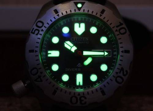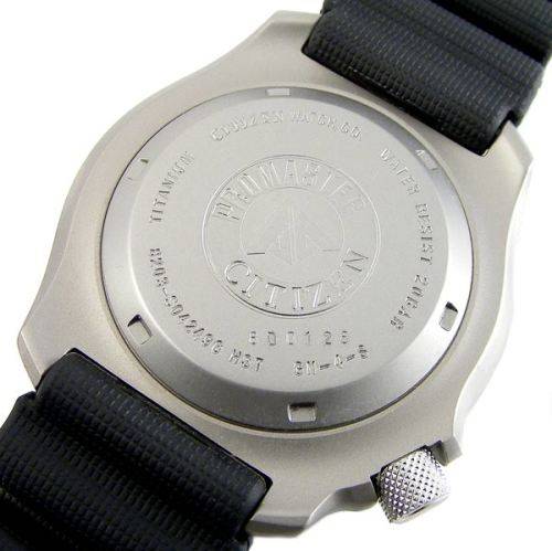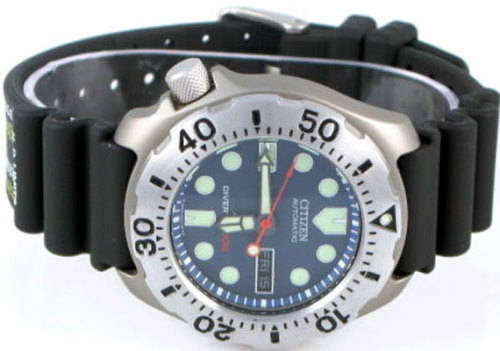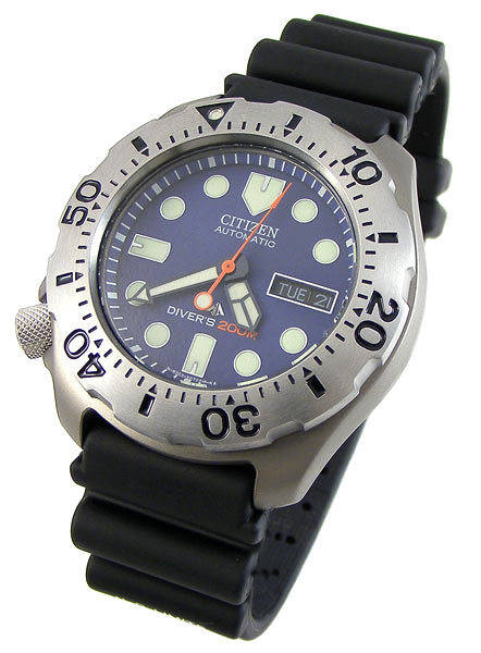 Description: NY0054-04LB Citizen Titanium Automatic 200m Diver's Watch Blue dial with luminous hands and numbers Titanium case and screw case-back Black rubber strap with N.D. Limits printed Uni-directional rotating bezel Water resistant 200m (20 bar) Day / Date display at 3 o'clock position Automatic movement Approximate measurements: Case diameter: 42mm (excluding crown) Weight: 80g