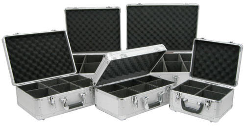 A range of robust aluminium flight cases for storage of CDs. The case features internal padding, with separators for the CDs. The outside of the case is made from tough diamond patterned aluminium with curved extrusions and chrome plated steel corners and hardware. The catches secure the removable lid and can be locked using the keys provided, the carry handle has cushioning for comfort. Ideal for the mobile DJ.