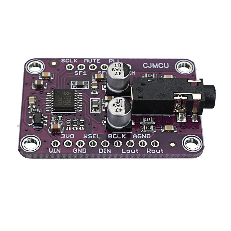This fully-featured UDA1334A I2S Stereo DAC breakout is a perfect match for any I2S-output audio interface. 3.3V - 5V logic levels (a rarity), and can process multiple different formats by setting two pins to high or low. The DAC will process data immediately, and give you a clear, analog, stereo line level output. It's even cool with MCLK-less I2S interfaces such as the Raspberry Pi (which it's ideal for) - a built in PLL will generate the proper clock from the incoming signal. For inputs, you can use classic I2S (the default) or 16-bit, 20-bit or 24-bit left justified data. You can set it up to take an input system/master clock but we default-set it to just generate it for you, so you only need to connect Data In, Word Select (Left/Right Clock) and Bit Clock lines. If you want, there's a mute pin and a de-emphasis filter you can turn on.