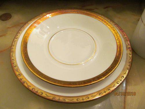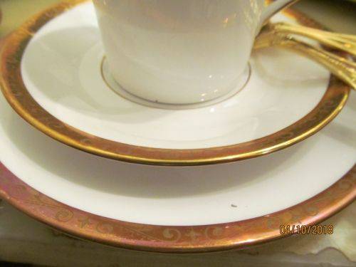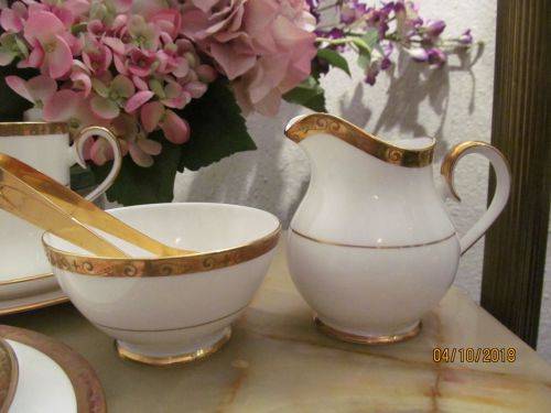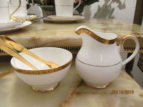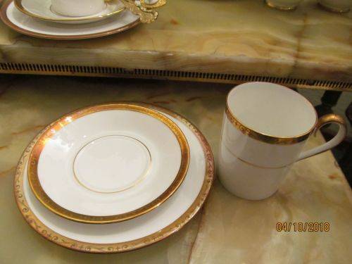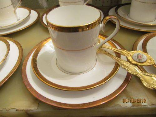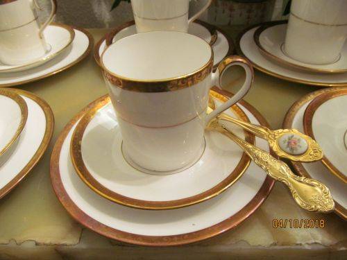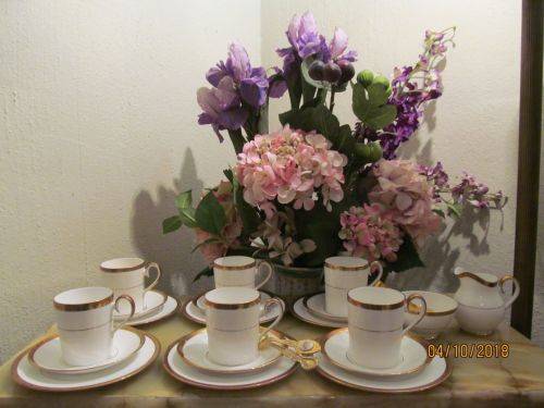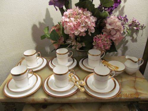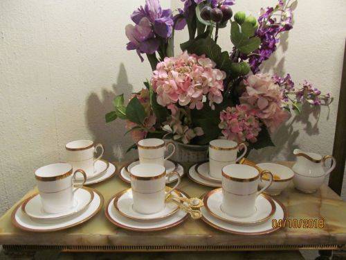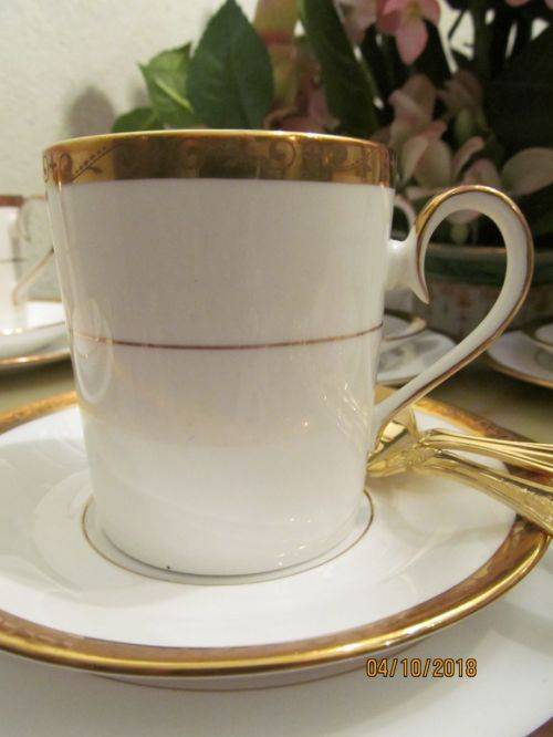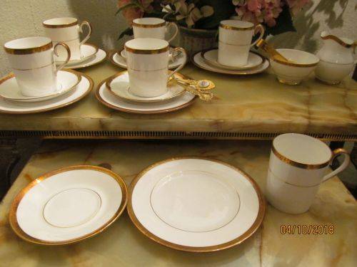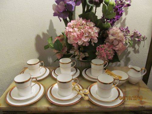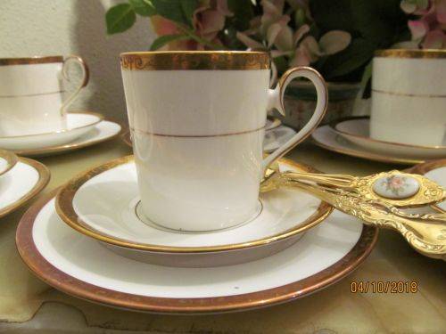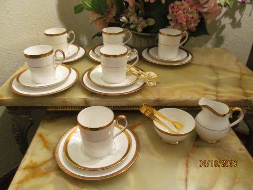 THIS SET CONSISTS OF SIX COMPLETE DEMITASSE TRIOS, A CREAMER AND A SUGAR BOWL, ALL EXQUISITELY DECORATED IN THE RICH GOLD "CLARENDON" PATTERN WHICH DEPICTS AN AWESOME SCROLL DESIGN UPON A PROMINENT GOLD BAND, PROUDLY DISPLAYED ON THE CRISP WHITE OF THE ITEM