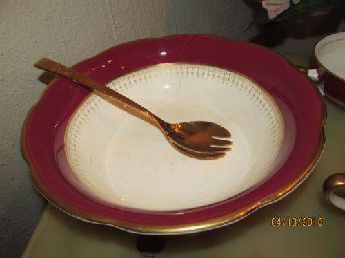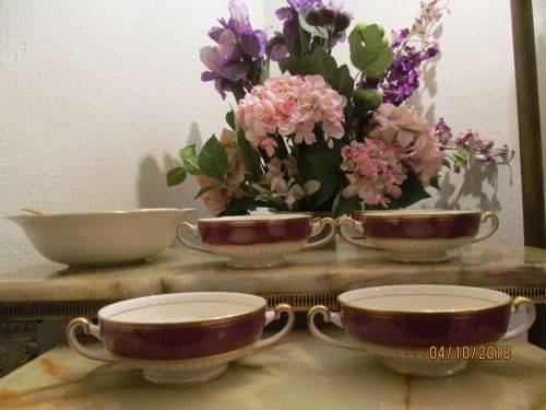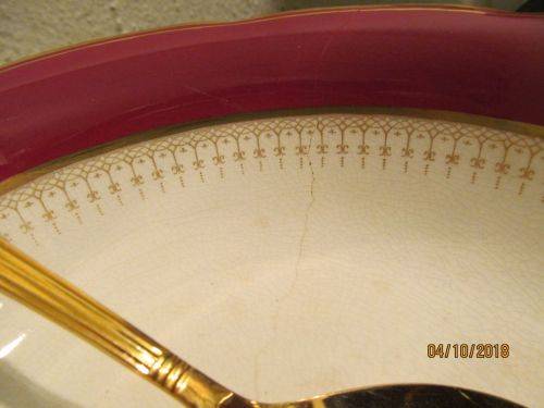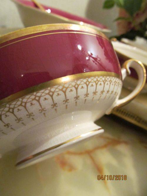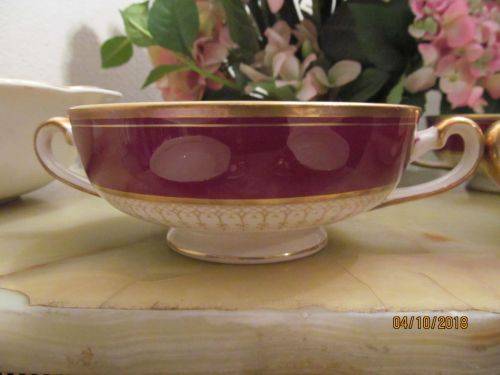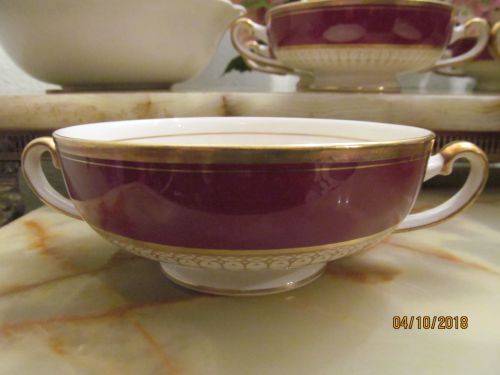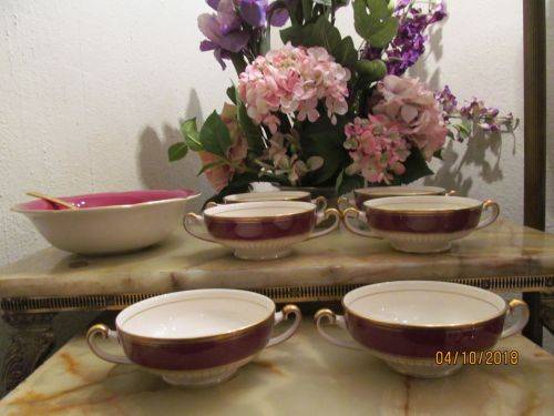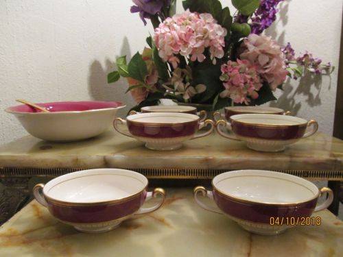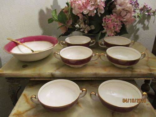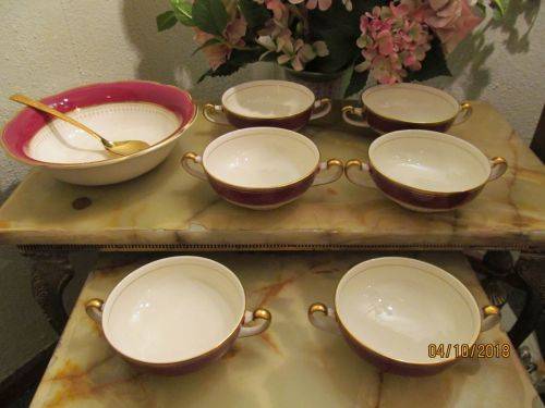 THIS SET CONSISTS OF SIX DESSERT BOWLS EACH WITH DOUBLE HANDLES AS WELL AS A MATCHING SALAD BOWL ALL DECORATED EXQUISITELY IN THE SIMPSONS CONTINUATION OF THE ASHLEY PATTERN WHICH WAS FIRST RELEASED IN 1930 AND THEN DISCONTINUED IN 1942, REAPPEARING IN THE 1950's WITH A MINOR MODIFICATION TO THE GOLD GILT PATTERNING. THE FIRST ASHLEY PATTERN EVEN APPEARS TODAY (SINCE 2006) IN THE BENARES HISTORIC HOUSE, ONE OF THE MISSISSAUGA MUSEUMS. THE PATTERN IS A MAGNIFICENT CLARET RED WITH RICH GOLD GILT PATTERNING AND TRIM.