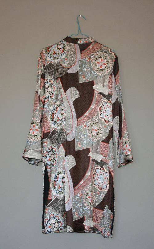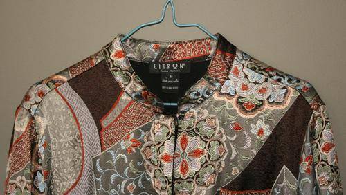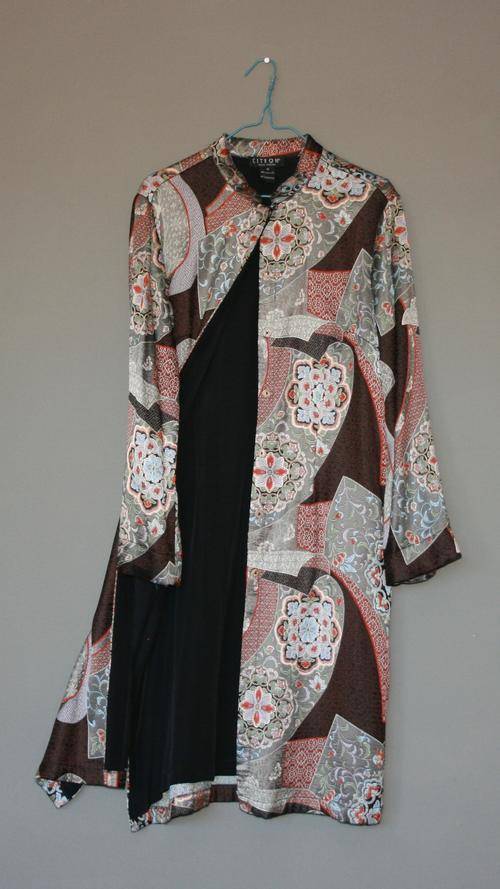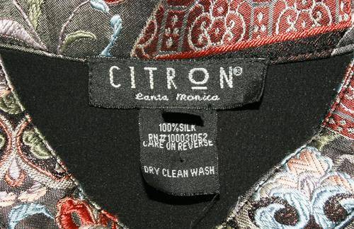 Citron Santa Monica is famous for their Asian-inspired prints in 100% Silk. The wind jacket, such as this one, is an iconic item, retailing at R2000.00+ new. Although secondhand, this jacket is in an excellent condition. Size medium, predominantly black with a grey, pink, soft green & blue Asian print and black lining.