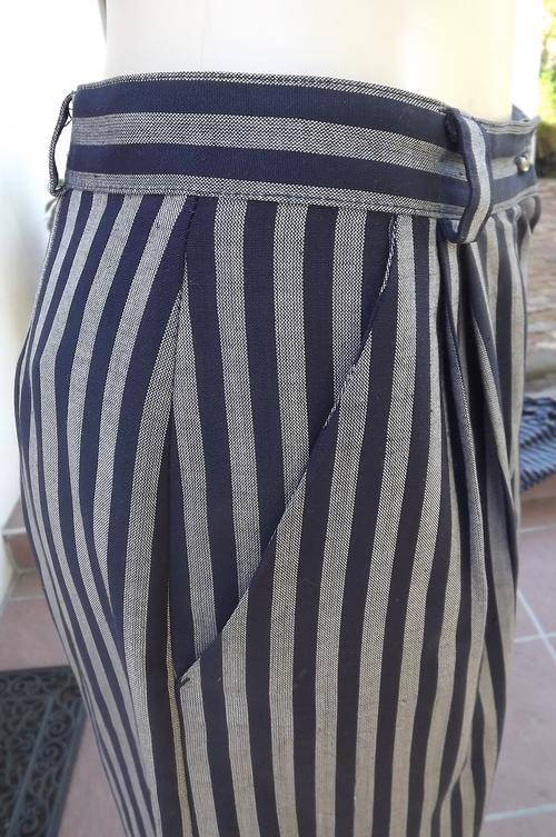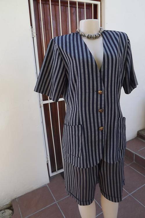 Classic 2piece short pant suit with jacket in navy/grey stripe.Size 38/14 by Merien Hall.High waiste