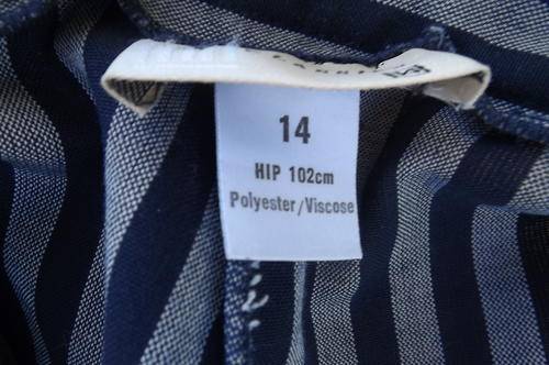 Classic 2piece short pant suit with jacket in navy/grey stripe.Size 38/14 by Merien Hall.High waisted pants with pleated front and side pockets.Turn ups on legs.Styled collarless jacket with 2 pockets and button down front.As new.Poly/viscose blend