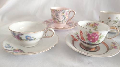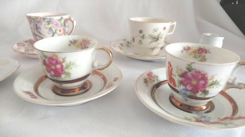 Beautiful collection of 5 small tea cups and saucers including adainty single candleholder.