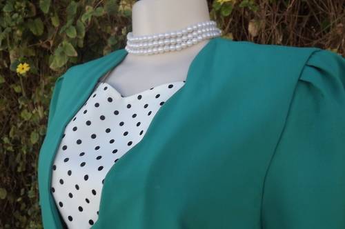 Classic jade colour dress for smart sear.Size 36/12 by LOVE RICH.Fully lined skirt with front zip.Fabulous scoloped v fronts.Black and white polkadot bib.Two strap with buckle at back for good fit.New condition