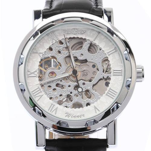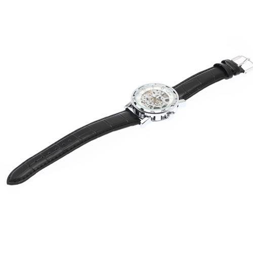 Classic Men's Leather Silver Dial Skeleton Mechanical Sport Wrist Watch