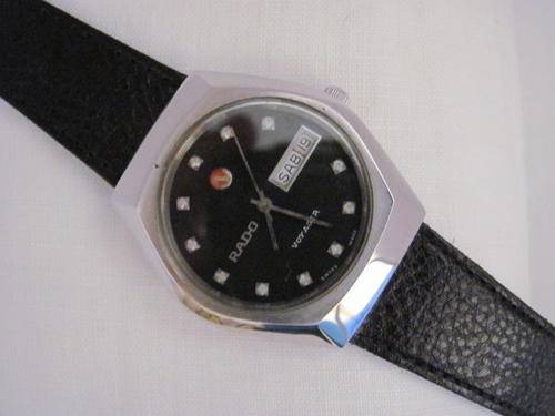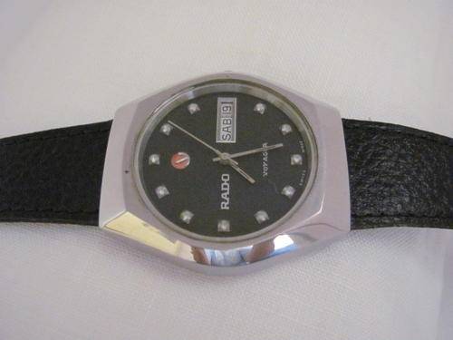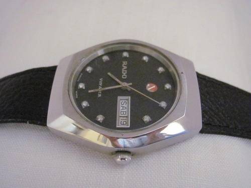 Dial: Classic Rado Black Dial, signed Rado Voyager Swiss Made, fancy applied hour marker, SS spade hour, minute and second hands. day date position at 3'oclock. Dial has been refinished and is in good condition.