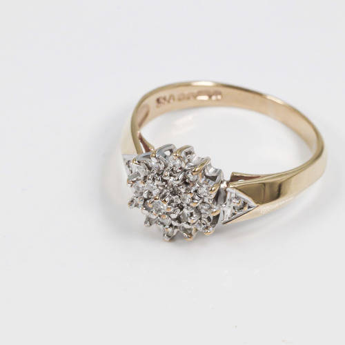 This vintage diamond cluster ring has a classic design featuring 21 x brilliant cut diamonds set in 9 ct white gold on a 9ct yellow gold shank. There is an interesting raised line where the shoulder joins the shank. The ring head has a snowflake appearance - a mass of diamonds in a marquise shape, measuring 10mm in diameter, with 4mm shoulders. The diamonds total 0,20 carats. The ring weighs 2,61 grams and is hallmarked 375 for 9ct gold, the jeweller's signature, the Sheffield Assay Mark and the date 1984. The piece comes with an Independent Jeweller Authentication and Valuation Certificate of R18'500.