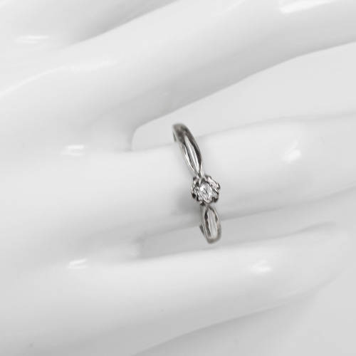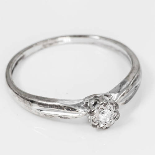 This vintage piece from England's Jewellery Quarter in Birmingham, features a brilliant-cut diamond set in 9ct white gold. The polished white gold shank is very narrow under the finger, thickening on the shoulders which bear a tactile ridge design. The dainty piece weighs 1,5 grams, and the ring size is a 6 1/4 or 'M 1/2' in British or SA sizing. The piece bears a number of hallmarks - 375 for 9 ct gold, the jeweller's signature, and the Birmingham Assay mark. It comes with an Independent Jeweller Authentication and Valuation Certificate of R10'000. Simple elegance.