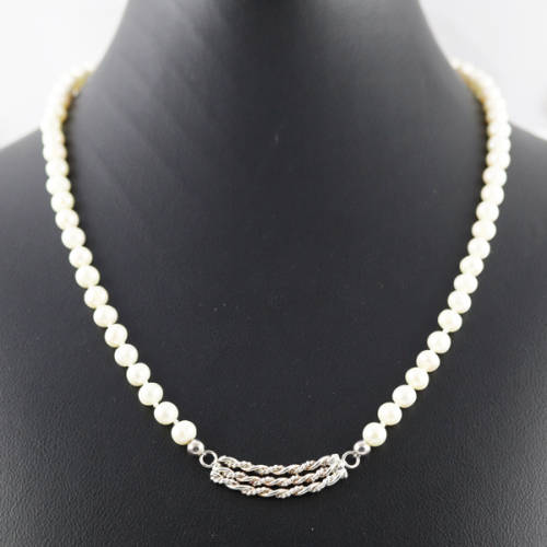 This elegant piece features a single strand of beautiful natural freshwater pearls with a pendant crafted in sterling silver - a triple strand of twisted rope detail in increasing lengths, allowing a gentle curve to the ?mm pendant. This then links to the pearl necklace with an openwork loop and single sterling silver bead on either side. The necklace measures 450mm long, with a spring clasp closure. The piece bears the 925 hallmark for sterling silver and weighs 12,2 grams. A single strand of pearls is a classic piece, this is classic - a modern twist!