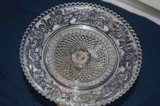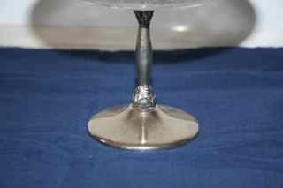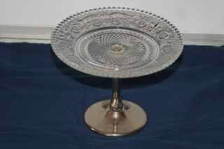 This clear, cut glass candy dish sits on a silver- tone (metal unknown) 3/4" base and measures about 12cm x15cm x 15cm. No flaws to glass. Has intricate design.